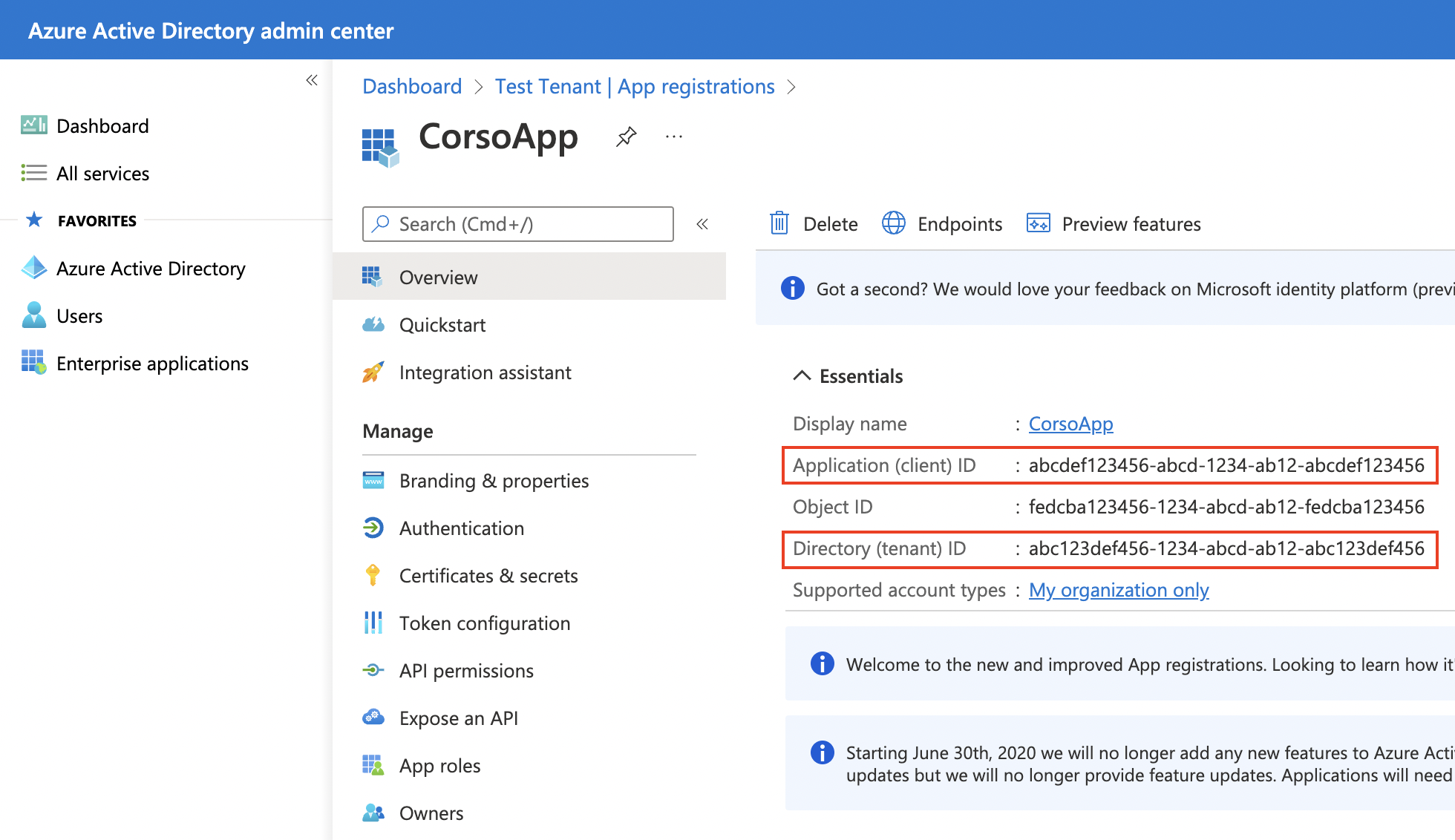 To view the tenant and client ID, select Overview from the app management panel.