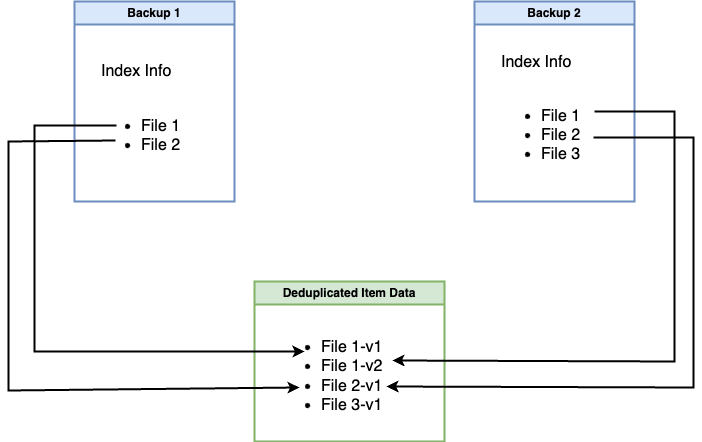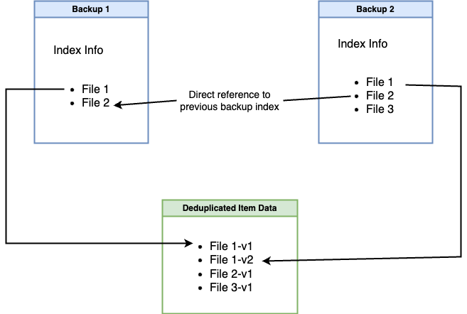Both independent backups and chained backups have the same information. Having independent backups generally creates more complexity when making a new backup while chained backups generally have more complexity during restore and backup deletion. Independent backups have more complexity when creating the backup as indexing information and item data references for deduplicated data may need to be sourced from previous backups. Chained backups have more complex restore as multiple backups may need to be searched for the item being restored. They also have more complex backup deletion as an item’s data can only be deleted if no backups in any chain refer to it. The figure below gives a high-level overview of the differences between independent backups and chained backups.