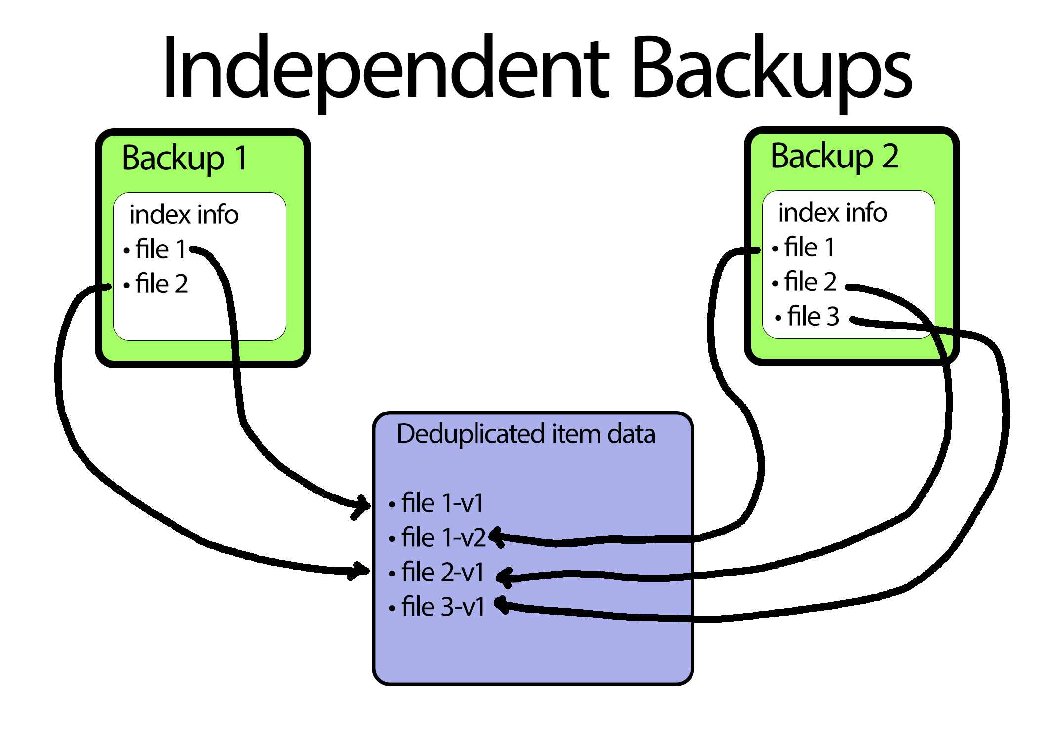 Both independent backups and chained backups have the same information. Having independent backups generally creates more complexity when making a new backup while chained backups generally have more complexity during restore and backup deletion. Independent backups have more complexity when creating the backup as indexing information and item data references for deduplicated data may need to be sourced from previous backups. Chained backups have more complex restore as multiple backups may need to be searched for the item being restored. They also have more complex backup deletion as an item’s data can only be deleted if no backups in any chain refer to it. The figure below gives a high-level overview of the differences between independent backups and chained backups.